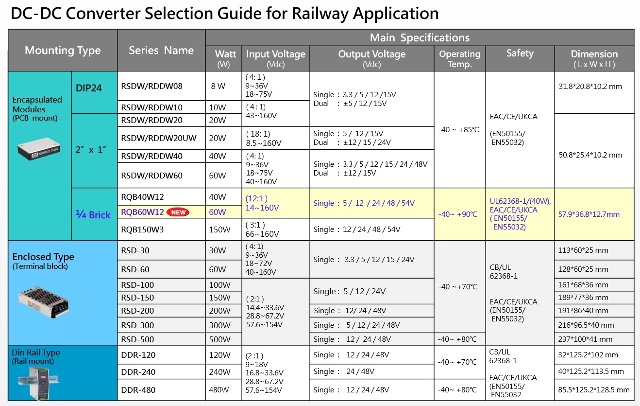Mean Well RQB60W12クォーターブリック鉄道DC-DCコンバータは、12:1DC ~14V 160VDC の極めて広い入力範囲が備わっているカプセル化されたモジュールで、グローバル鉄道システムのメインストリーム公称電圧をカバーしています。これらの60W装置には、5V/12V/24V/54V 48Vシングル出力電圧、-40°C ~ +90°C動作温度範囲、2KVAC または3KVDC 入力/出力絶縁、完全保護(過温度、過電圧、過負荷、入力低電圧、短絡)が備わっています。その他の特徴には、国際規格ピン、最大91.5%の高い効率性、EN 50155準拠、外部回路へのEN 45545-2準拠があります。Mean Well RQB60W12クォーターブリック鉄道用DC/DCコンバータは、バス、トラム、地下鉄、鉄道システム、ならびにテレコム/データコムシステム、ワイヤレスネットワーク、振動、埃、極端な温度をはじめとする過酷な環境に最適です。特徴