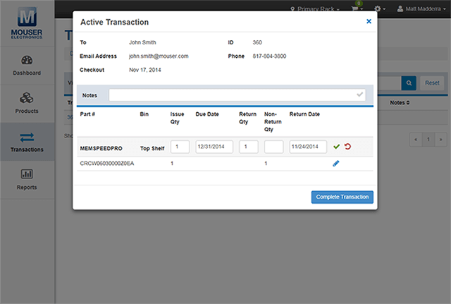 トランザクション詳細のモーダルウィンドウから、トランザクション・メモの追加から出荷数量や返却期限といった内容に至るまで、さまざまな編集を行うことができます。また、返却数量と返却日を入力して「トランザクション完了」ボタンをクリックし、アクティブなトランザクションを「クローズ済」にすることもできます。